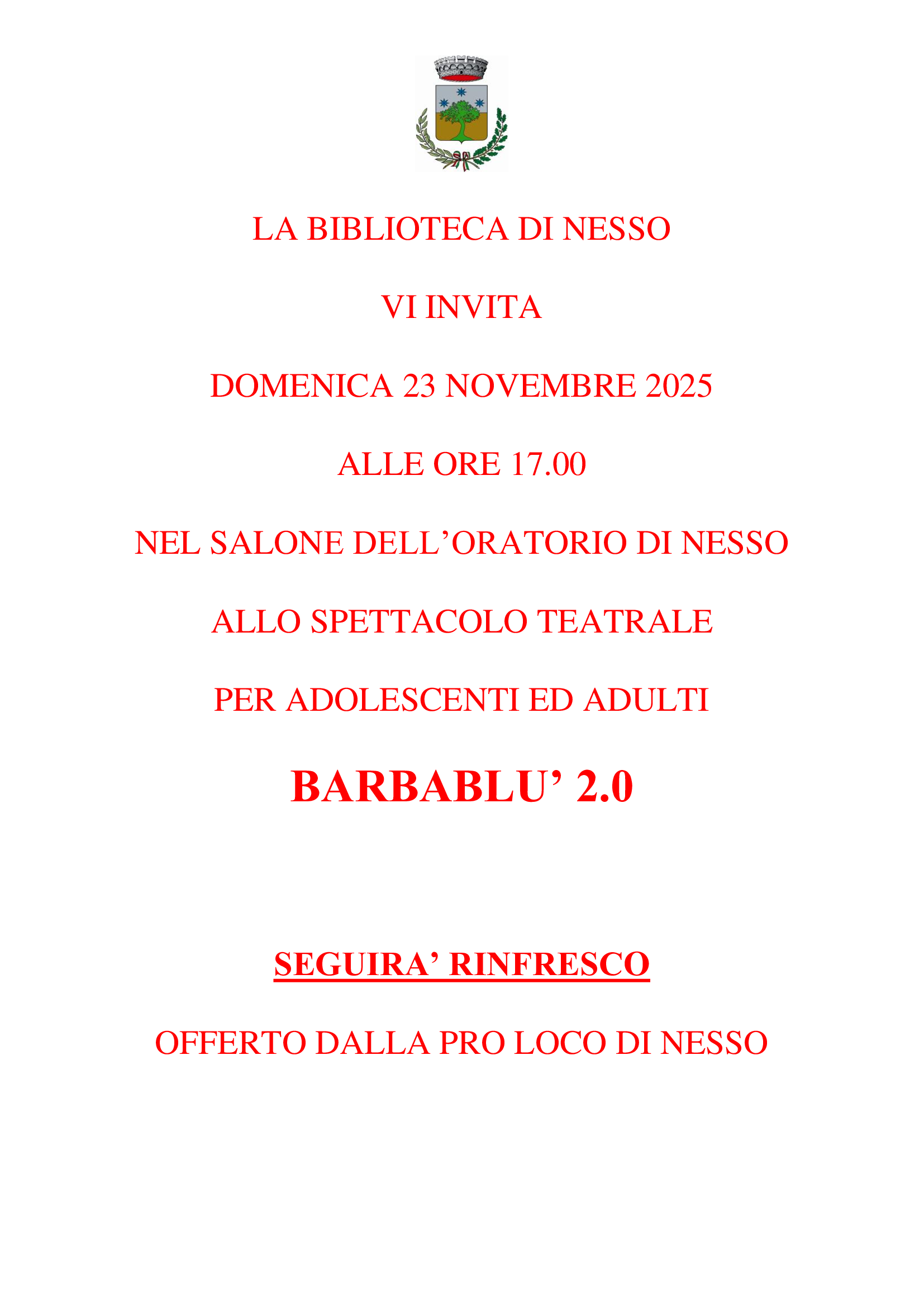 La biblioteca di Nesso vi invita domenica 23 novembre 2025 alle ore 17.00 nel salone dell’oratorio di Nesso allo spettacolo teatrale per adolescenti ed adulti Barbablu’ 2.0 Seguirà Rinfresco offerto dalla Pro Loco di Nesso